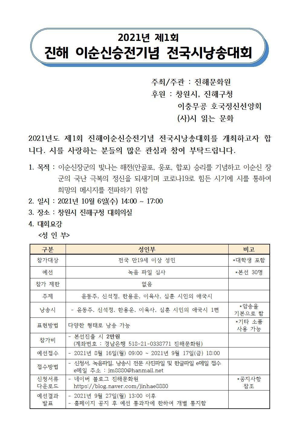 2021년 제1회 진해이순신승전기념 전국시낭송대회 개최 안내