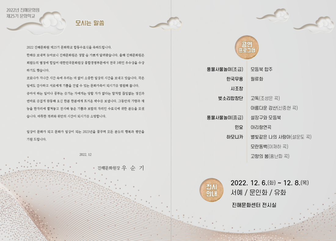 2022년 제25기 문화학교 합동수료식 및 전시 · 발표회가 진해문화센터 공연장 및 전시실에서 개최될 예정입니다.