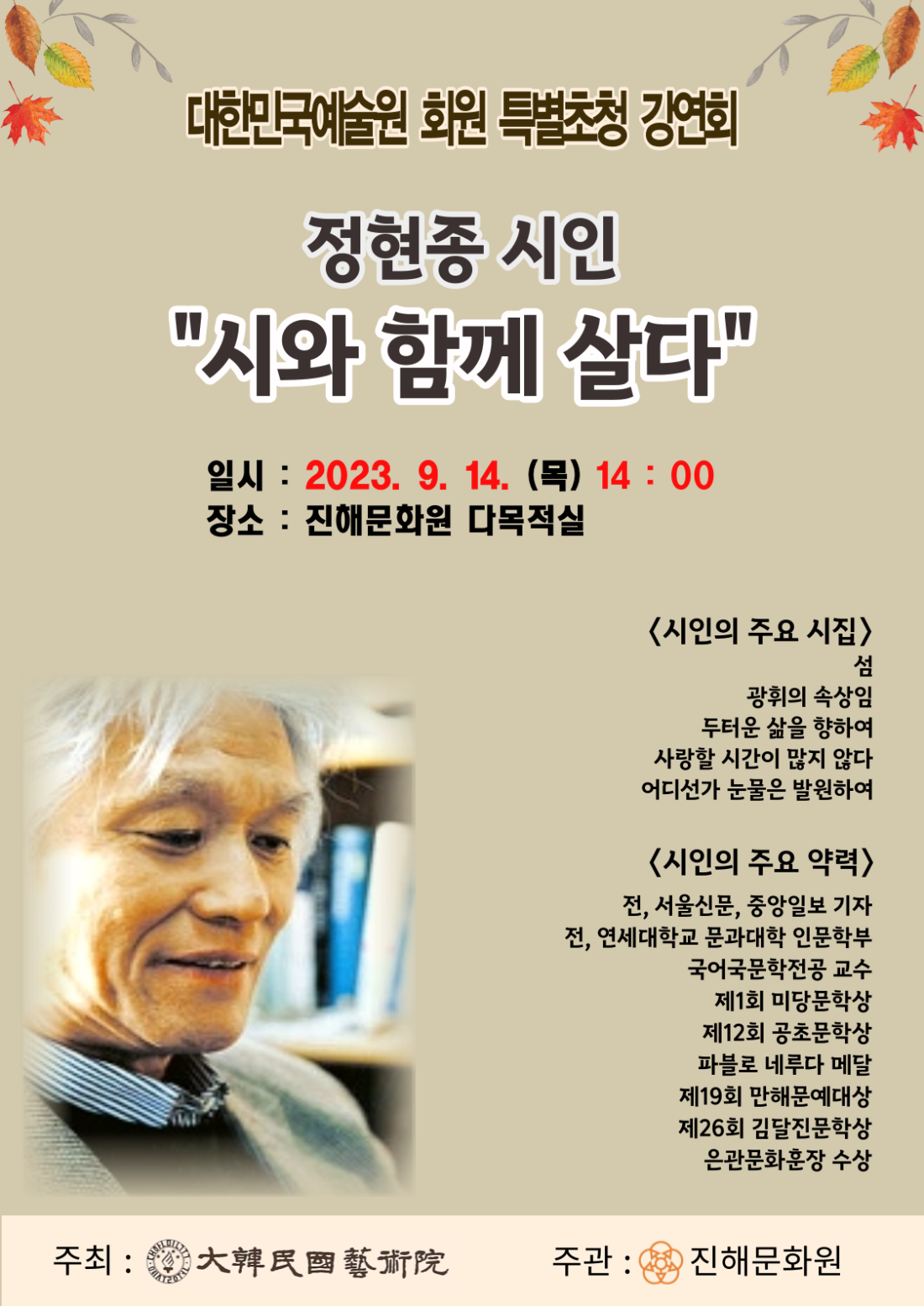 대한민국예술원 회원 정현종시인 초청강연회가 열립니다.