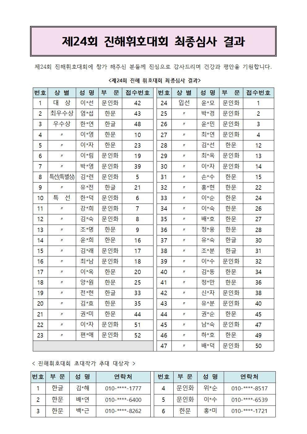2023년 제24회 진해휘호대회 결과 안내