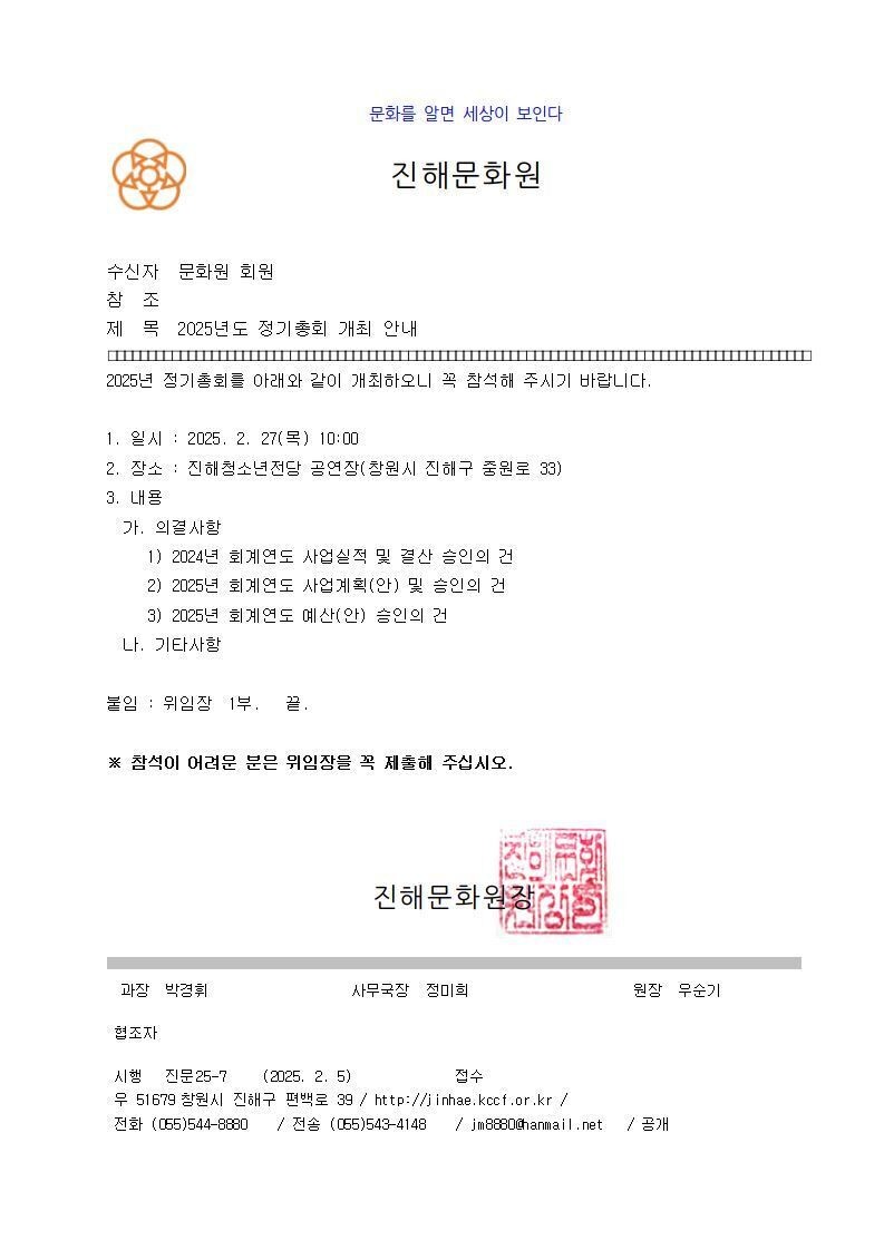 2025년 진해문화원 정기총회 개최 안내