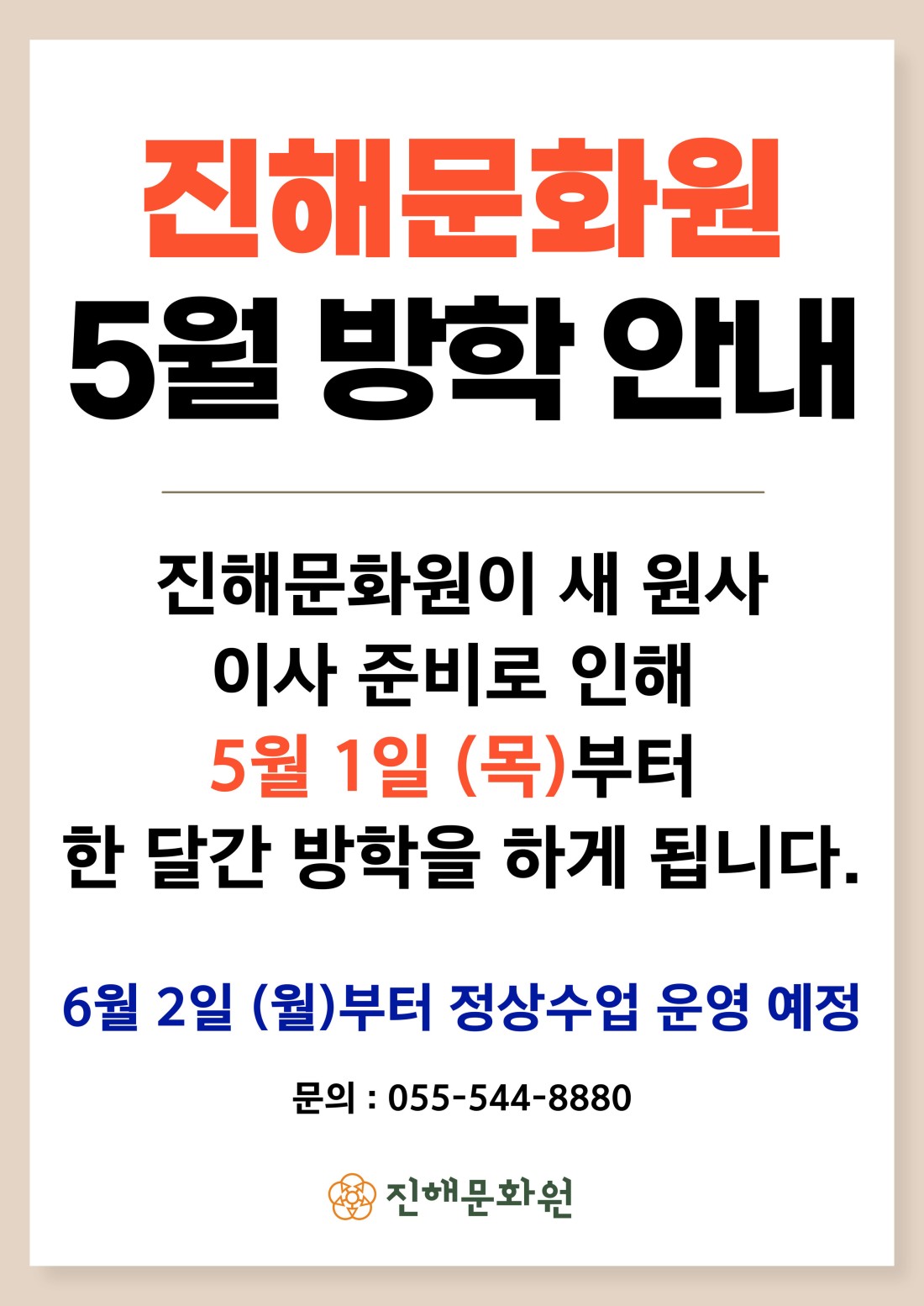 진해문화원이 새 원사 이사 준비로 인해 5월 1일 목요일부터 한 달간 방학을 하게 됩니다.
