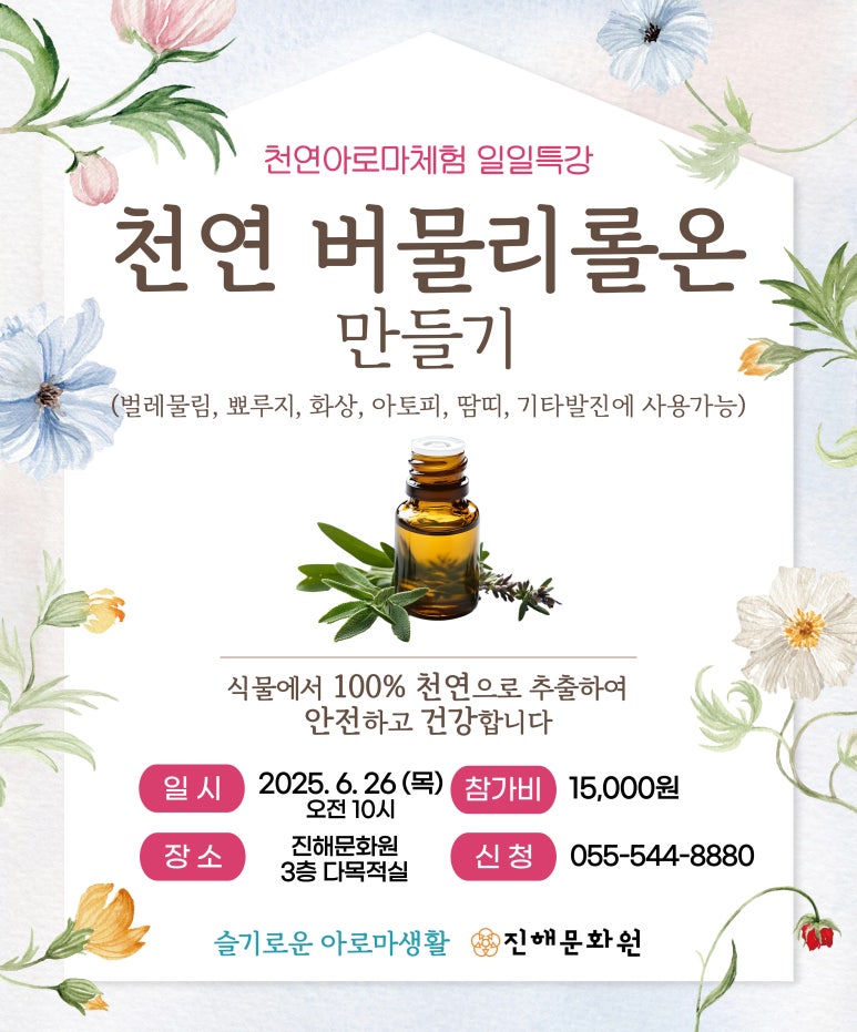 6월 일일특강 천연아로마체험 <천연 버물리롤온 만들기> 참가자를 모집합니다.