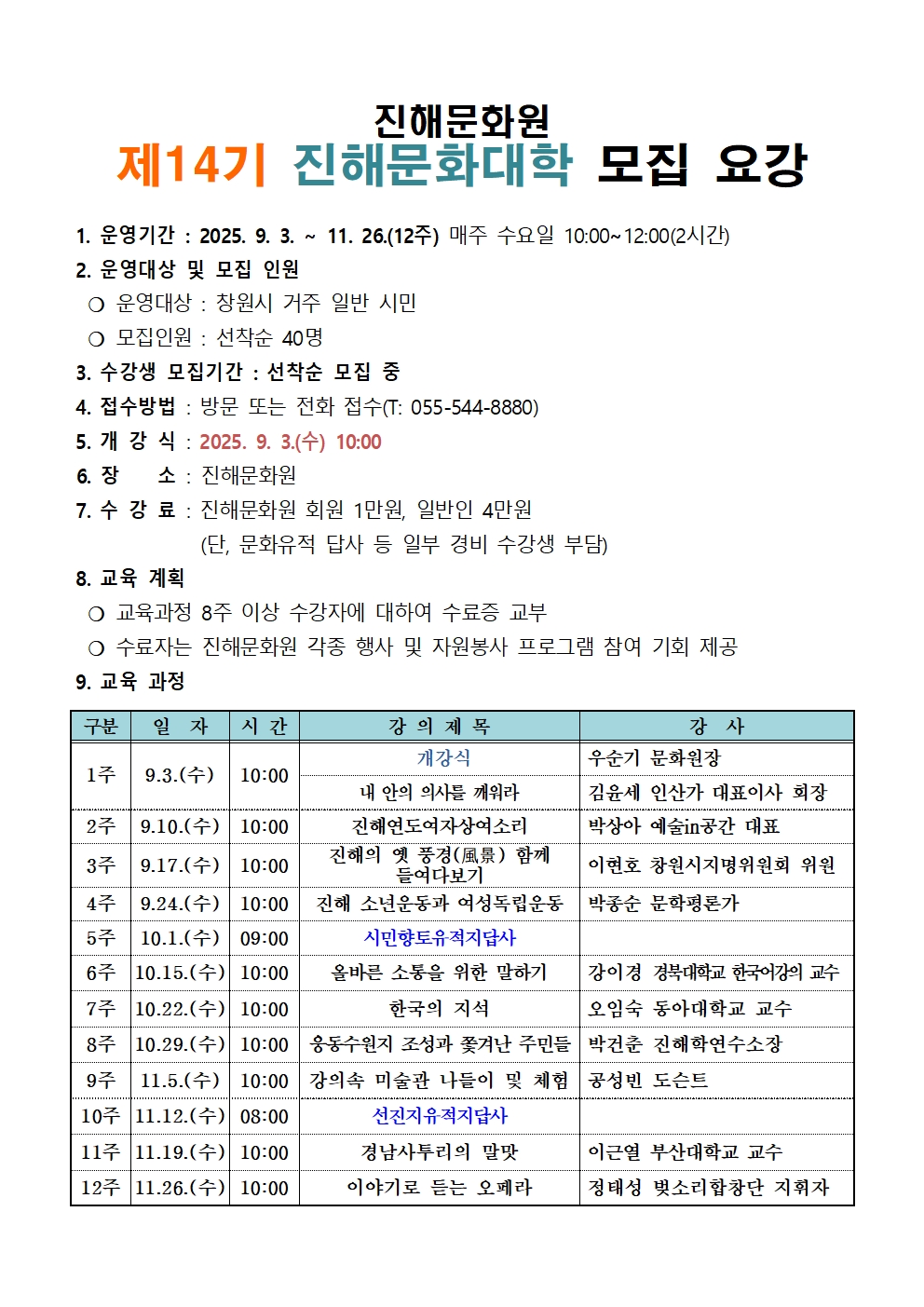 2025년 제14기 진해문화대학 수강생 모집 안내